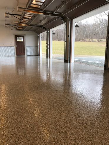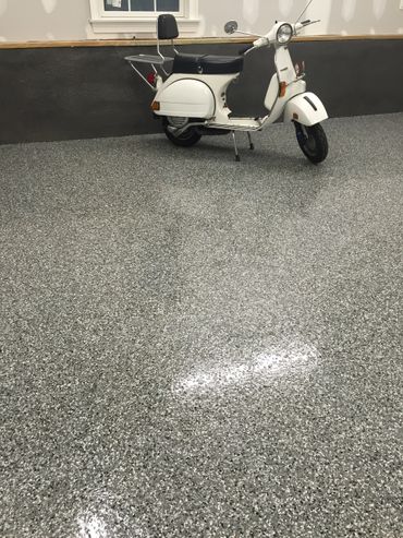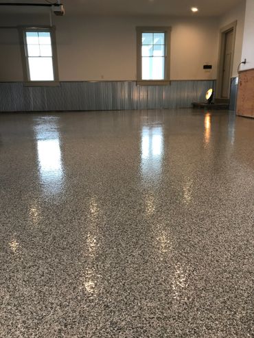 For a durable cost effective floor finish many clients are turning to color flake epoxy. Color flake systems are just that, flakes of color that are bonded between layers of epoxy to provide a system thickness from 1/16th inch to 1/8th inch combined thickness. This thickness is what is needed to provide impact resistance from dropped tools or equipment and provide a rubbery consistency rather than a rigid brittle surface that might otherwise chip easily. The color flakes come is a wide range of standard colors as well as sizes and can be mixed and blended in different percentages to create many custom colors and effects, any color combination you could possibly think of.